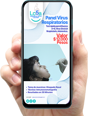Test rápido para Influenza A+B, Virus Sincicial Respiratorio, Adenovirus. • Toma de muestras: Hisopado Nasal • Técnica: Inmunocromatografia • Resultados en 30 Minutos • Valor $12.000 Puede ver los resultados online, ingresando a nuestro sitio web; http://laboratorio5deabril.cl/ Casa Matriz: Centro Medico Cordillera, Av. Argentina 648, Chillán Toma de Muestra: Centro Medico 5 de Abril, Calle 5 de abril 570, Chillán