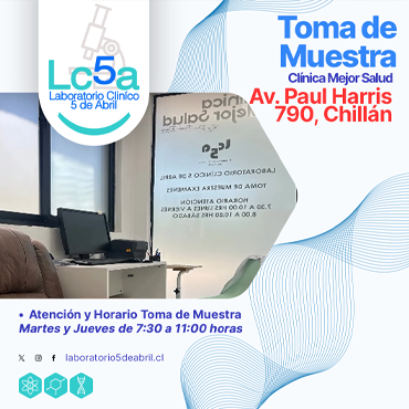 Laboratorio Clínico 5 de Abril, más cercano, al alcance en y el horario de sus pacientes, comunica la apertura de un nuevo punto de toma de muestra, ubicado en sector nororiente de Chillán. Ingreso por el estacionamiento de la Clinica. CLÍNICA MEJOR SALUD Av. Paúl Harris 790, Chillán HORARIO TOMA DE MUESTRA Martes y Jueves de 07:30 a 11:00 horas.